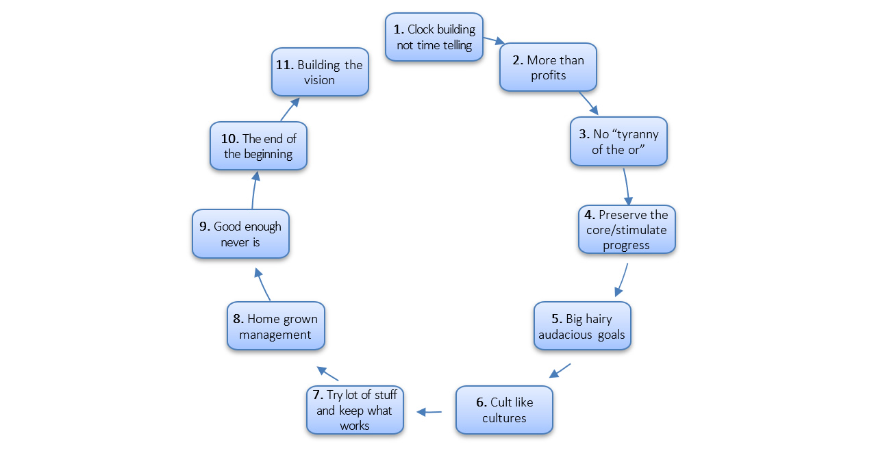 Visionary companies often get off to a slow start, but set ‘big hairy audacious goals’ and continue to experiment with ideas that move them towards their vision while sticking to their core values. The success of visionary companies comes primarily from successful underlying processes and core values, not a special idea, patent, or trade secret.