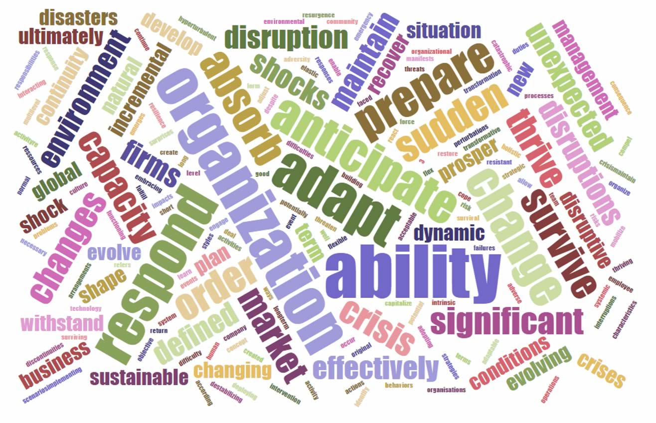 There are at least 23 separate definitions of organizational resilience available via a Google search, and pulling each of these together into a word cloud produces the following result: